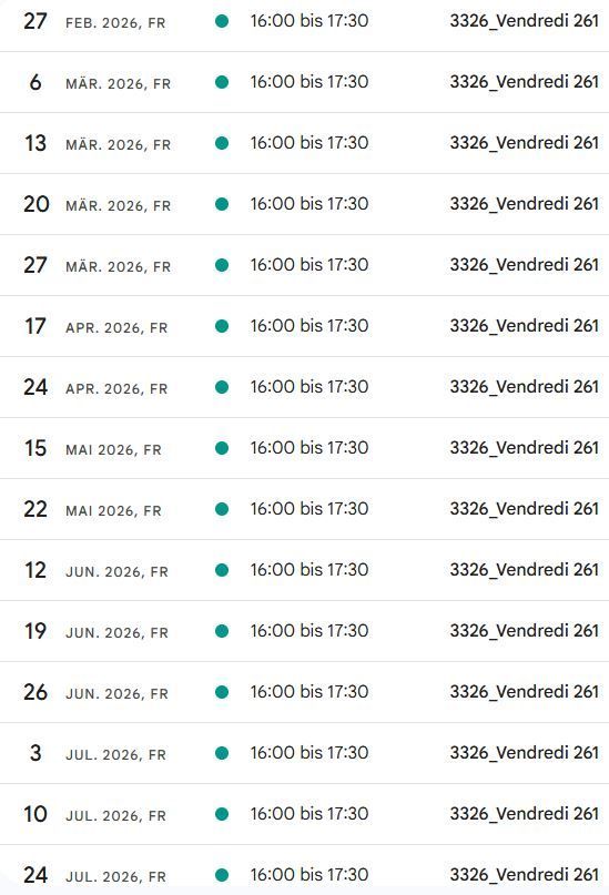 15 x Freitag, ab dem 27.02.2026, 16:00-17:30 Uhr